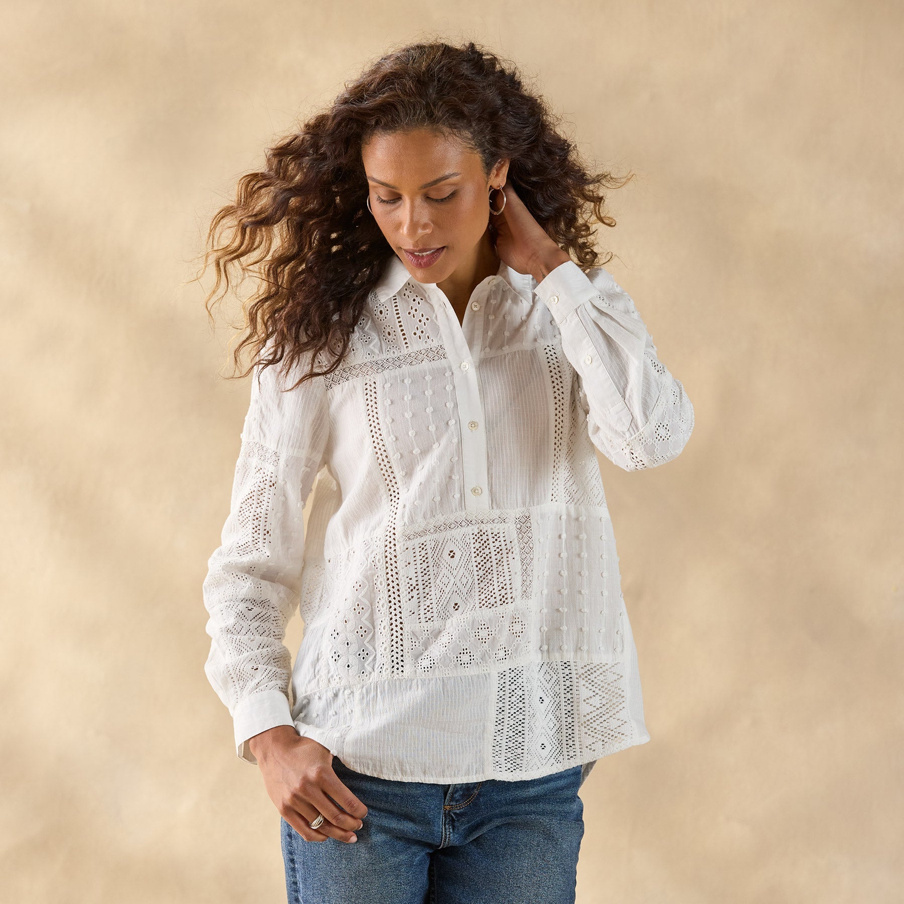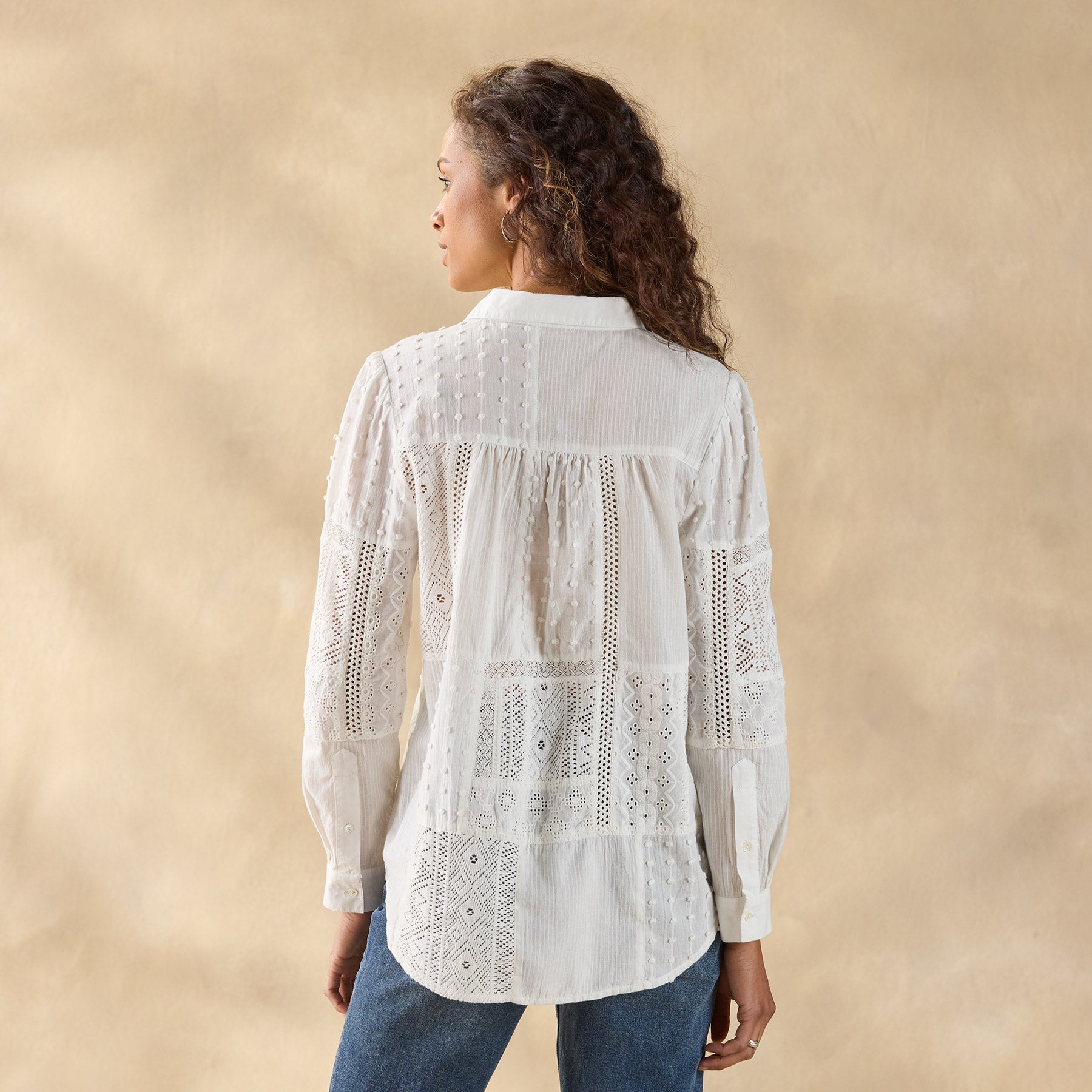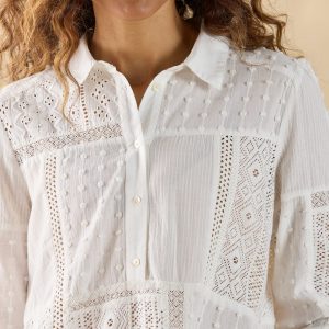 Lace and eyelet patchwork details create a melody of beauty on our oh so feminine relaxed fit top with ruching at the front yoke. collar with henley placket and shirttail hem. Cotton/Other Fiber. Hand wash. Imported. Exclusive. Sizes XS (0–2). S (4–6). M (8–10). L (12–14). XL (16–18). XXL (20–22). Approx. 26.5l.