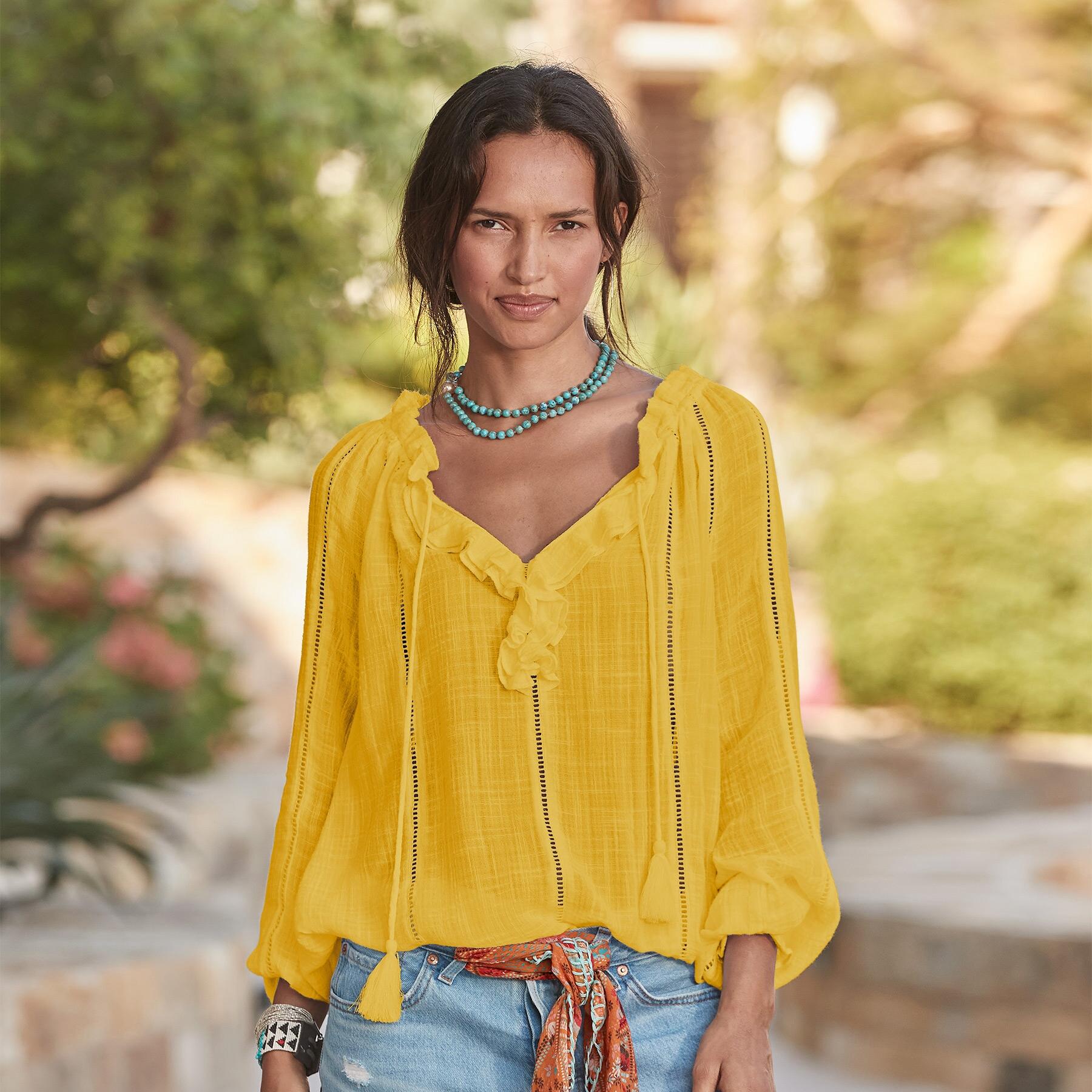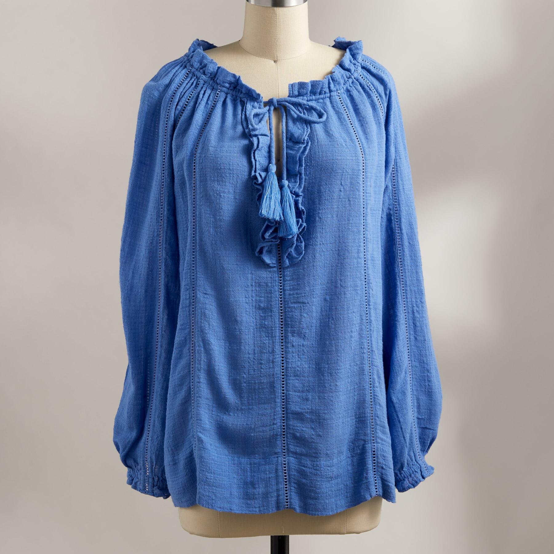 Embrace your artistic spirit in our sheer. easy-fit top with ladder lace. ruffle neckline and tassel ties. Cotton/viscose. Hand wash. Imported. Exclusive. Sizes XS (0 to 2). S (4 to 6). M (8 to 10). L (12 to 14). XL (16 to 18). XXL (20 to 22). Approx. 26-1/2L.
