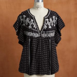 Easy and beautiful. our relaxed notch neckline top is so lovely with contrast embroidery detail on the bodice and feminine flounce with raw edge detail at the sleeves. Textured double gauze. Cotton. Machine wash. Imported. Exclusive. Sizes XS (0–2). S (4–6). M (8–10). L (12–14). XL (16–18). XXL (20–22). Approx. 25.5l.
