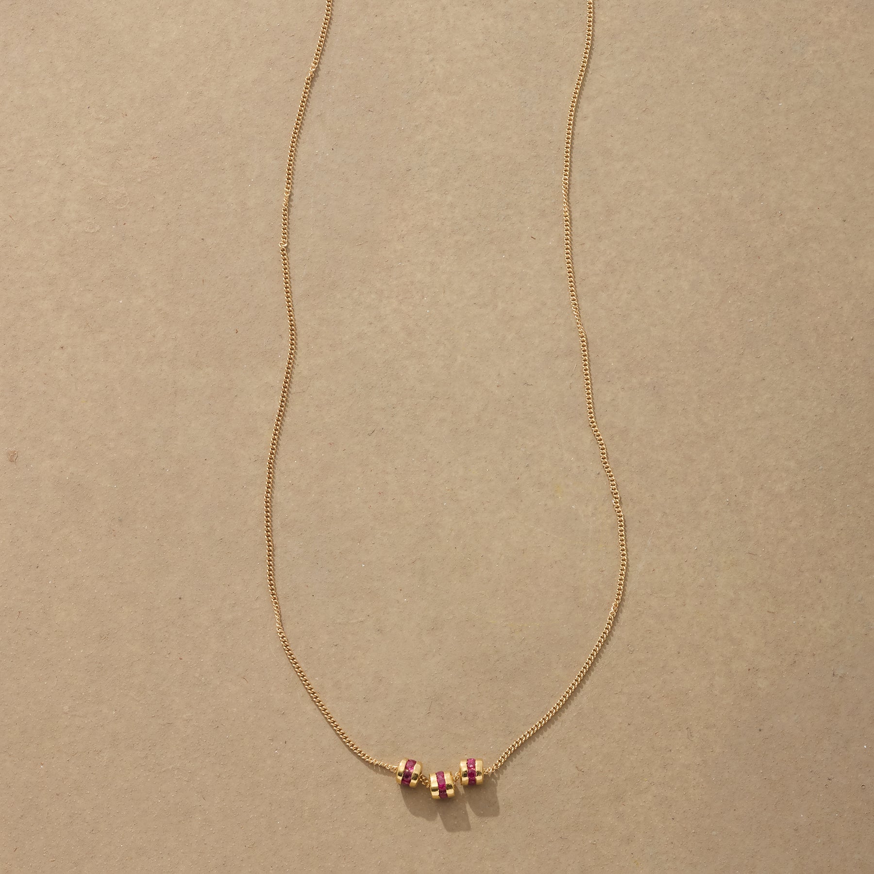Rubies light up the three-wheel beads that slide freely along a fine 14kt gold chain. Lobster clasp. Handmade in USA. 16l.