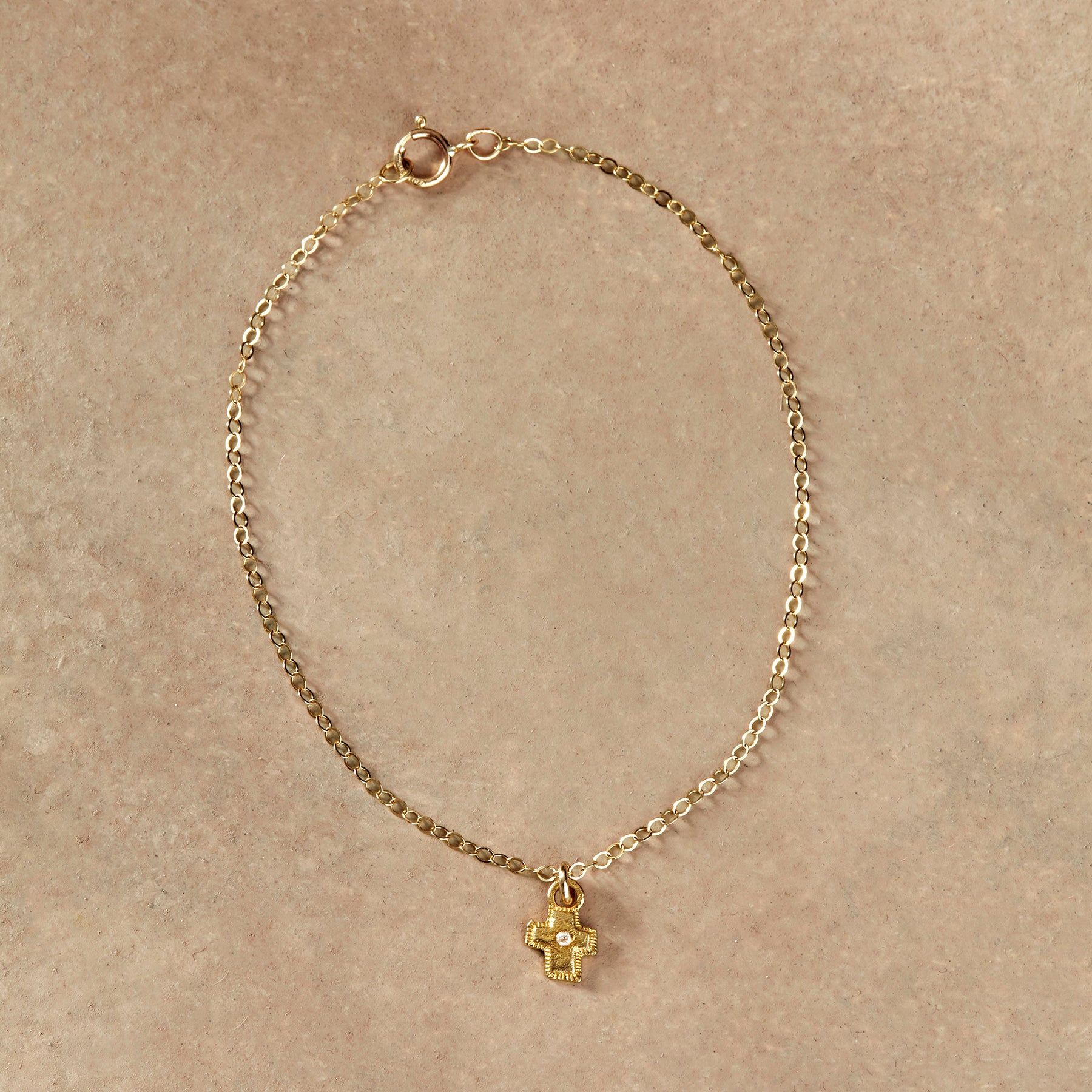 A single diamond gleams from a petite gold vermeil cross in an enduring expression of faith. 14kt gold chain and spring ring clasp. Handcrafted in USA. 7-1/2l.