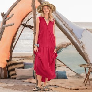 Feel your best in our easy. sleeveless crinkle textured dress with tonal embroidery at the placket and a feminine ruffle detail at the neckline. Two tiers. side seam pockets. Cotton. Machine wash. Imported. Exclusive. Sizes XS (0-2). S (4-6). M (8-10). L (12-14). XL (16-18). XXL (20-22). Approx. 53l.