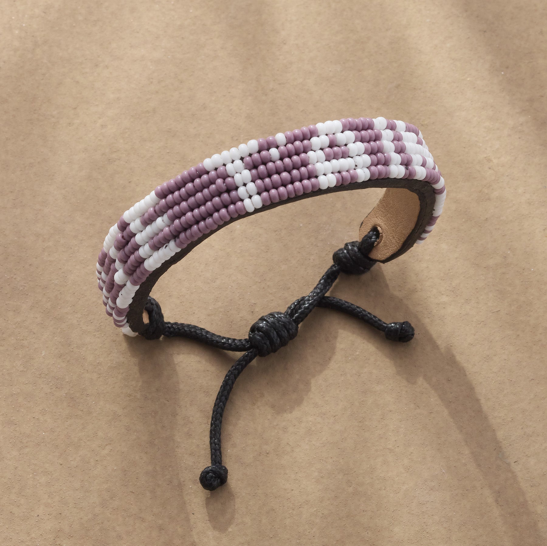 The French phrase for I love you is written across five strands of lavender seed beads. This handcrafted bracelet is backed in leather and secures with an adjustable macrame slider. Exclusive. 5-1/2 ?C 7-1/2l.