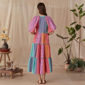 Bright gingham patchwork lends a pop of whimsy to this bold dress. Notched collar. 3/4 blouson sleeve and ladder lacing at the tiers. Viscose. Machine wash. Imported. Sizes XS (0 to 2). S (4 to 6). M (8 to 10). L (12 to 14). XL (16 to 18). XXL (20 to 22). Approx. 58L.