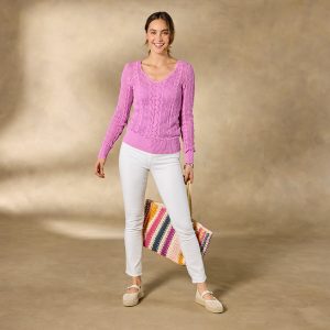 Open pointelle stitch adds light and airy style to this versatile. V-neck sweater with hand-crocheted neckline detail. rib trim. and refined sleeve shape. Camisole included. Cotton/linen. Hand wash. Imported. Exclusive. XS (0-2). S (4-6). M (8-10). L (12-14). XL (16-18). XXL (20-22). Approx. 23l.