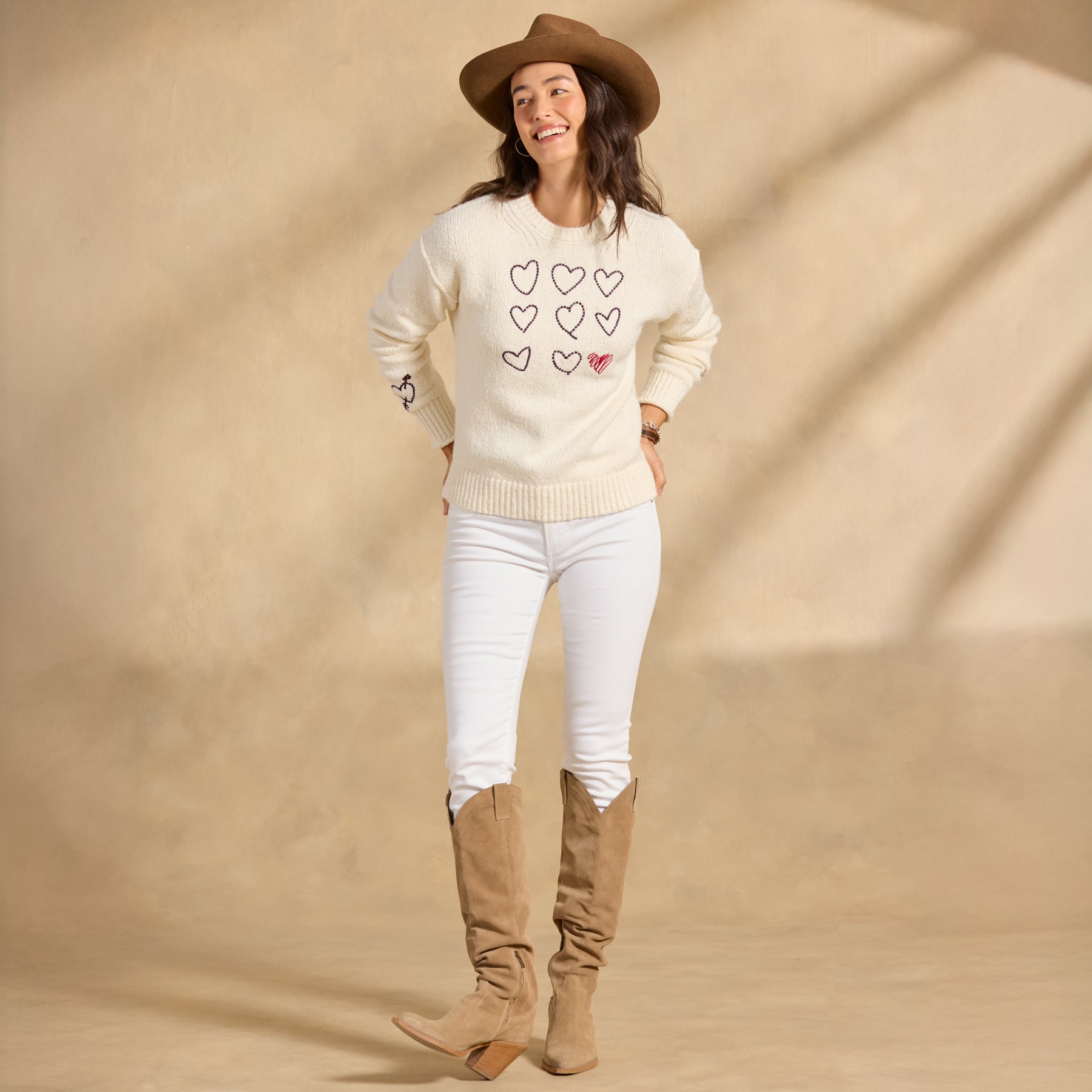Mon Coeur means my heart in elegant French. and our romantic sweater features a tic tac toe of embroidered hearts. In cozy. chunky slub yarn. with rib transfer details. exposed seaming. rib trim. side slits. jersey roll at cuffs and embroidered heart at cuff. Relaxed fit with hi-lo hem. Cotton/nylon/acrylic/merino wool. Hand wash. Imported. Exclusive. Sizes XXS (00). XS (0–2). S (4–6). M (8–10). L (12–14). XL (16–18). Front approx. 21l.