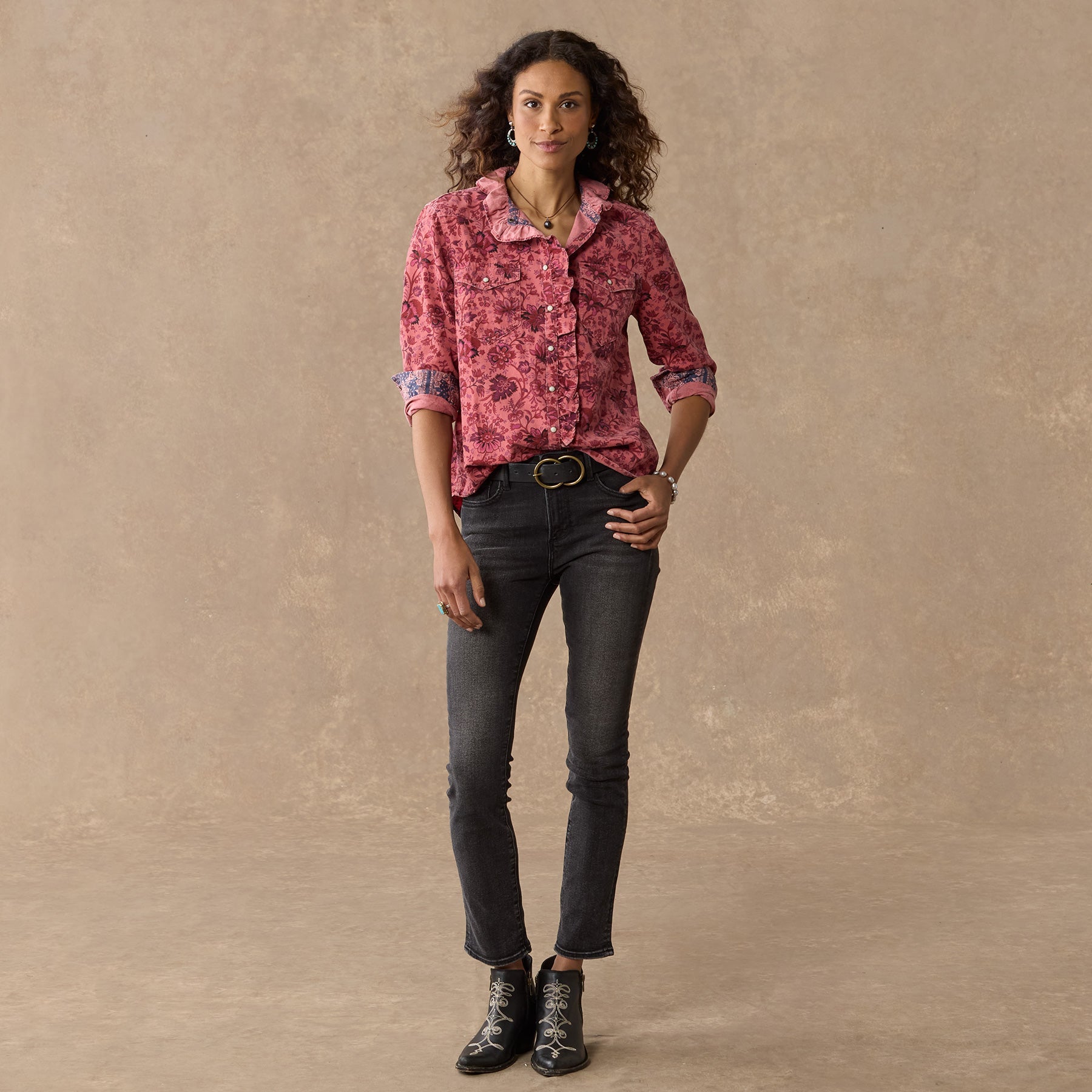 Floral printed and overdyed. this Western inspired. soft corduroy shirt is beautiful with ruffles at the neckline for a feminine twist. Two patch pockets. snap closure and bandana print detail inside. Cotton. Machine wash. Imported. Exclusive. Sizes XXS (00). XS (0??). S (4??). M (8??0). L (12??4). XL (16??8). Approx. 24l.
