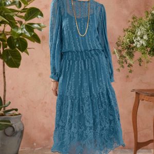 Tonal embroidery ripples and floats over ethereal silk in this dreamy. sea-inspired dress with gathered waist. banded cuffs and scoop neckline. Fully lined. Silk. Dry clean. Imported. Exclusive. Sizes XS (0 to 2). S (4 to 6). M (8 to 10). L (12 to 14). XL (16 to 18). XXL (20 to 22). Approx. 51-1/2L.
