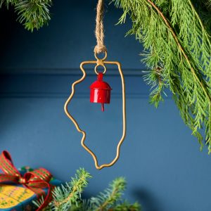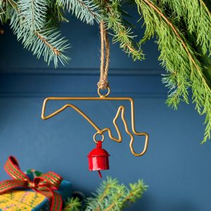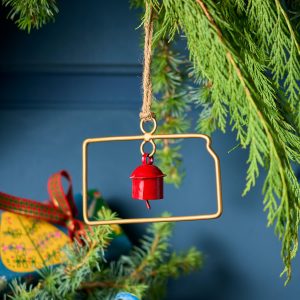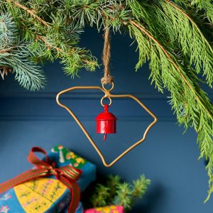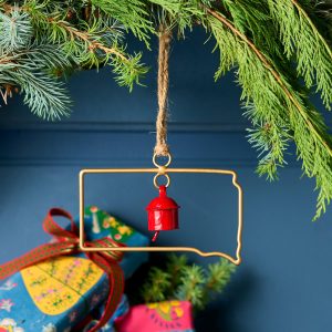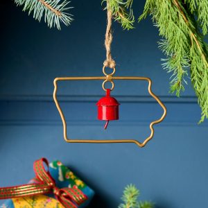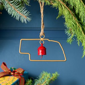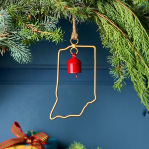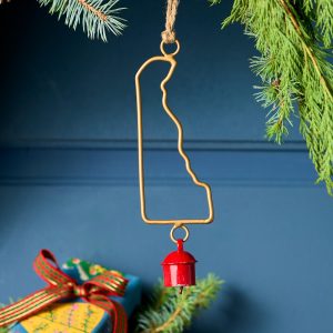 Represent your favorite state on the tree this year with a handcrafted ornament outlined and shaped to artisan perfection. Each U.S. state shape is intricately created and includes an expertly crafted and tuned bell. All 50 states available. Brass/iron/jute. Imported. Exclusive. Sizes vary depending on which state shape is chosen. range from 2w to 4.75w x 2l to 4.75l.