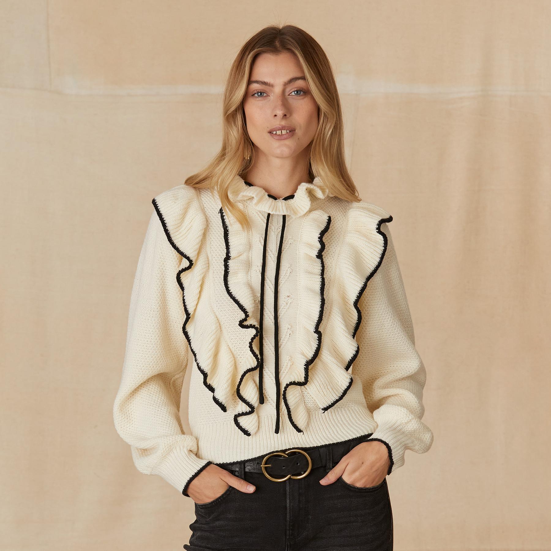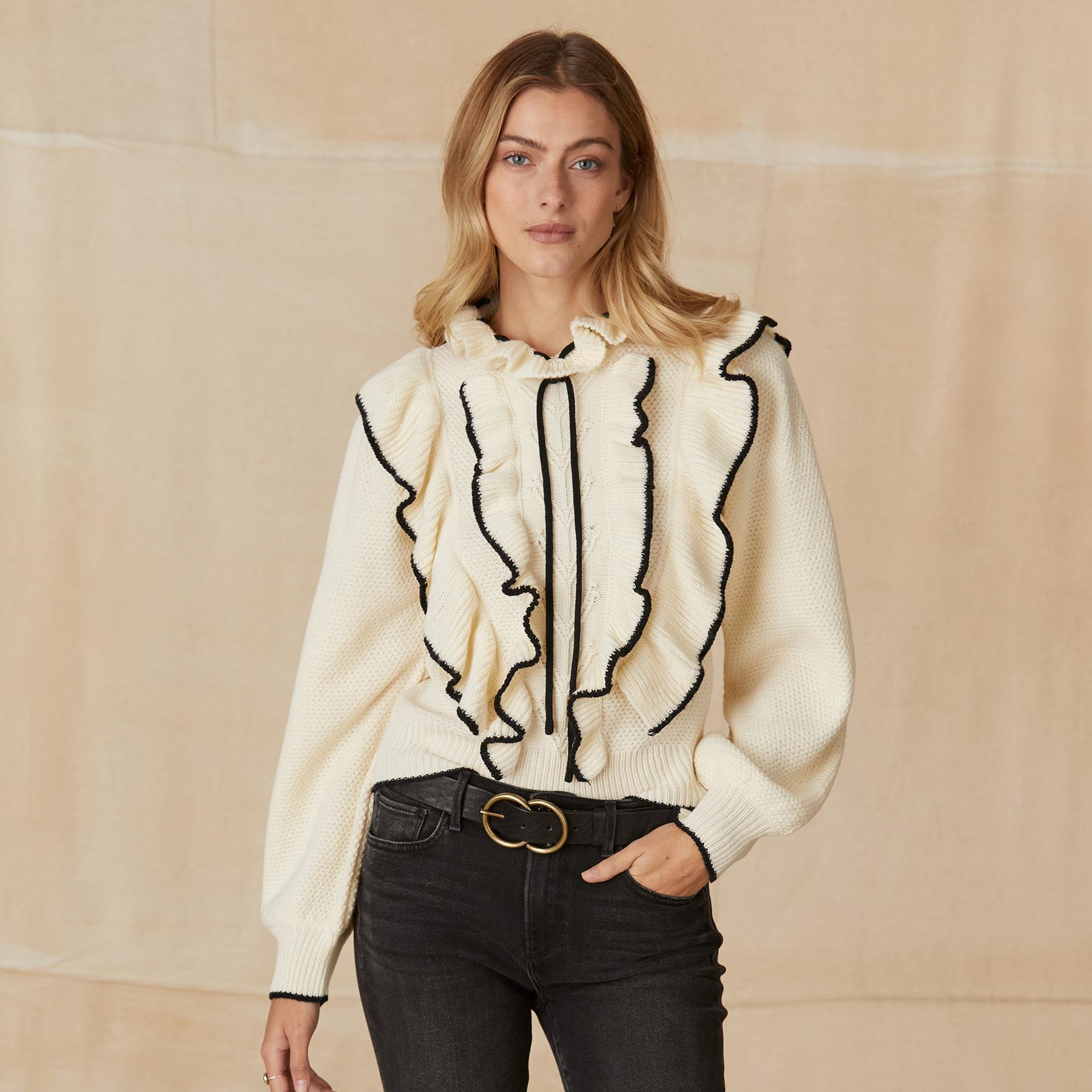 Black-tipped ruffles provide beautiful contrast and movement to this Sundance exclusive. Tie at neck and ribbed cuff. Acrylic. Hand wash. Imported. Sizes S (4-6). M (8-10). L (12-14). Approx. 17.5l front. 21.5l back.