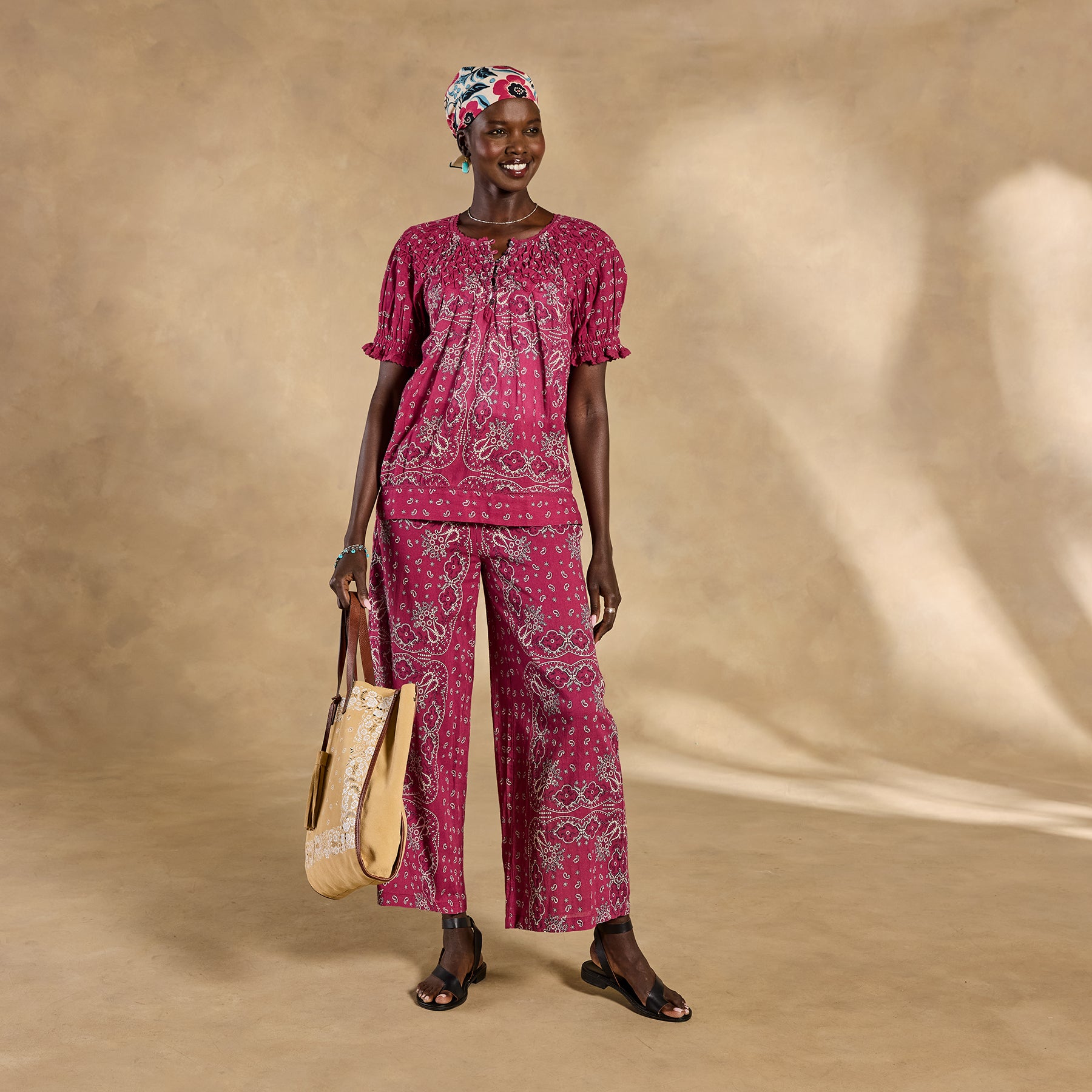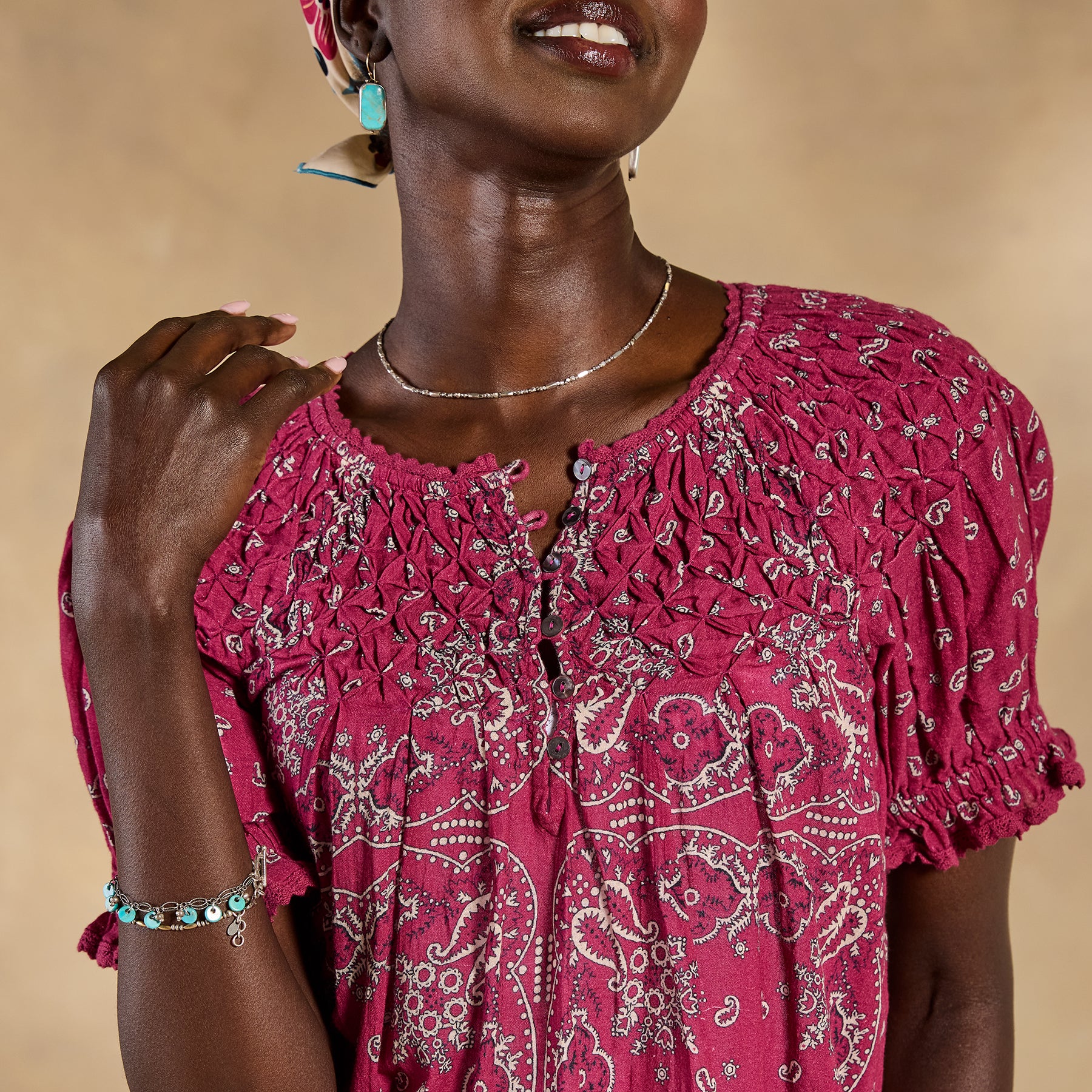 Feminine textures like pineapple smocking and lace accents combine with bold printed details on our feminine Woodrose Top. Button placket with loop closure. elastic cuffs. Cotton. Machine wash. Imported. Exclusive. Sizes XS (0?C2). S (4?C6). M (8?C10). L (12?C14). XL (16?C18). XXL (20?C22). Approx. 24.5l.